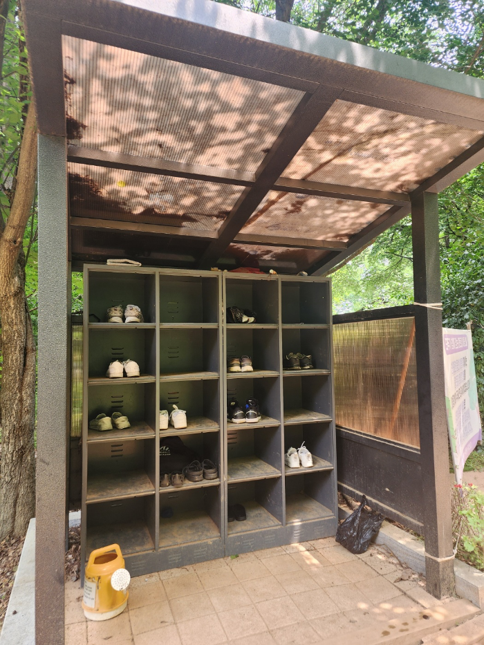 - 세족장 구비 : 6명이 한번에 씻을 수 있는 세족장이 있어 발수건만 준비 해 가면 됩니다. 비누는 사용 못한다고 하며, 흙을 털어내기 쉽게 선반 위에 돌멩이를 올려 두었어요.